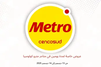 متاجر مترو كولومبيا تعلن عن تخفيضات جديدة بعنوان « عروض خاصة لمدة يومين » المتوفرة حتي يوم 14 ديسمبر 2025, عروض جديدة وأسعار فقط في كولومبيا.