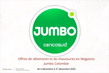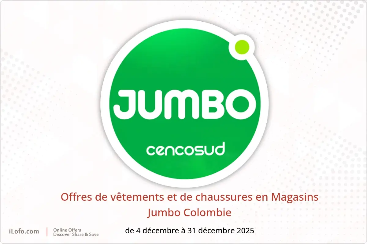 Magasins Jumbo Colombie annonce de nouvelles réductions intitulées « Offres de vêtements et de chaussures » disponibles jusqu'au 31 décembre 2025, de nouvelles offres et prix uniquement en Colombie.